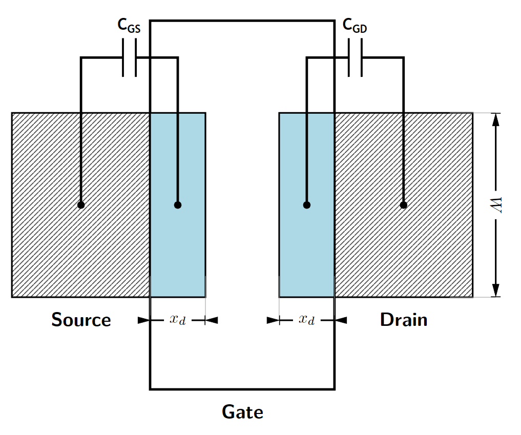 \[C_{GS} = C_{GD} = \frac{\epsilon_{ox} x_d W}{t_{ox}}\]